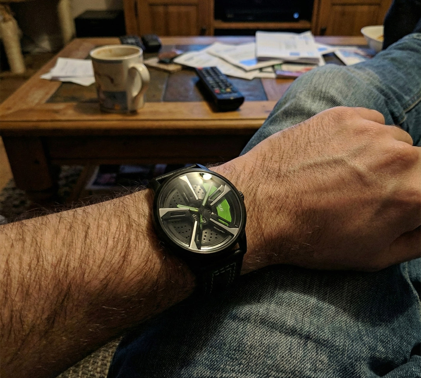 Честно казано, бях малко скептичен дали ще изглежда добре на живо, но часовникът е топ. Пасва идеално на по-ежедневно облекло и е доста лек на ръката. Зеленият елемент се набива на очи веднага.